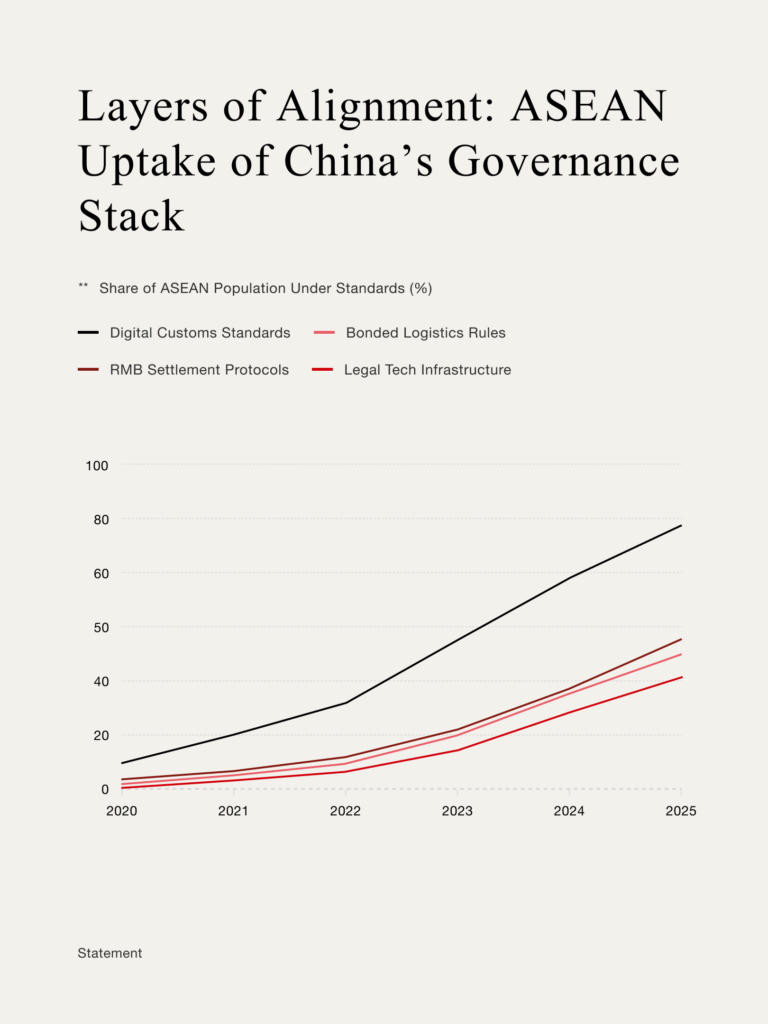 “Inclusive multilateralism” functions as an ideological mirror to the US-led “rules-based order.” Where the latter implies a fixed set of norms curated by advanced economies, Beijing’s formulation invites flexible alignment based on outcomes, not on from which country any initiative originated. This has enormous appeal to middle-income ASEAN states: according to a 2025 survey by the ISEAS-Yusof Ishak Institute, 76% of ASEAN policy elites believe that China has “increased its influence in ASEAN without demanding political alignment”—a 12-point increase from 2022. In countries like Malaysia and Brunei, where China has invested heavily in legal tech and digital standards, that number exceeds 80%.