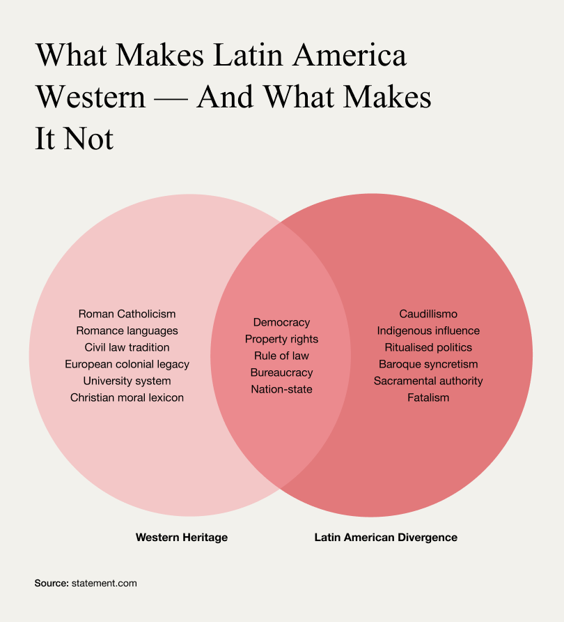 But Latin America is not Western as the West understands itself. What exists from Mexico to Argentina is its own civilisational formation, mixed in blood and structure, excessive and baroque in form, and Catholic in soul. The error lies not in divergence from Europe or the United States, but in the delusion that such divergence signals deficiency. Latin America does not fail because it resists becoming Western. Its failure lies in the pretense.