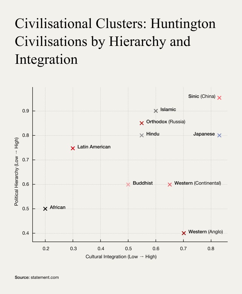 But elsewhere lies the truth: China never imitated the West and reinterpreted its Confucian and bureaucratic soul through Marx. Russia remains statocratic, Orthodox, and cynical, drawing continuity from Tsar to Soviet to oligarch. And even Central Europe, though Western, reintegrates its Catholic memory into its political form.