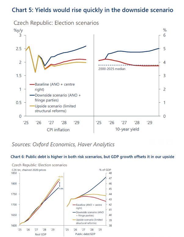 Die negative Variante geht davon aus, dass Babiš' Bewegung eine Regierungsmehrheit mit „Randparteien” (der Bewegung Stačilo, der SPD und möglicherweise den Motoristen) bilden wird. Dies würde laut Oxford Economics eine negative Reaktion der Märkte hervorrufen: Befürchtungen hinsichtlich Verschwendung, höherer Inflation und einer Schwächung der institutionellen Qualität.