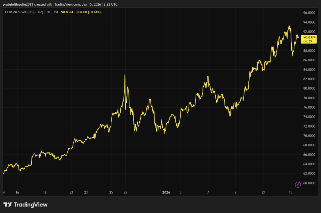 The price of gold and silver has benefited from the confusion surrounding Powell, geopolitical uncertainty about a possible attack on Iran, and the absence of a concrete solution in Venezuela. It even shot above $93 per ounce. The silver market is thus in full swing.