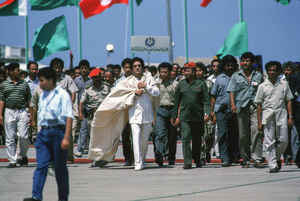 Libyan President Muammar Gaddafi (center, rear, in white robe) and his entourage arrives walk across the tarmac at Mitiga Airport outside Tripoli, Libya, 1989. Photo by Barry Iverson/Getty Images