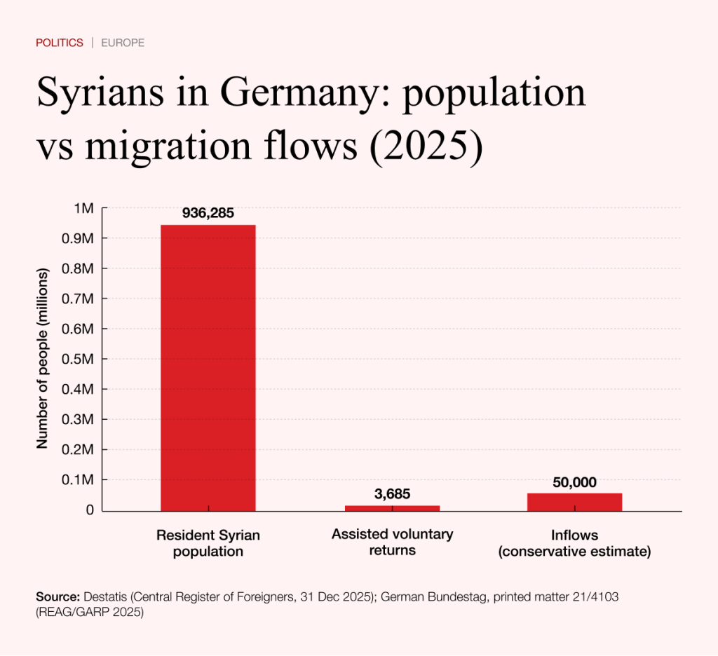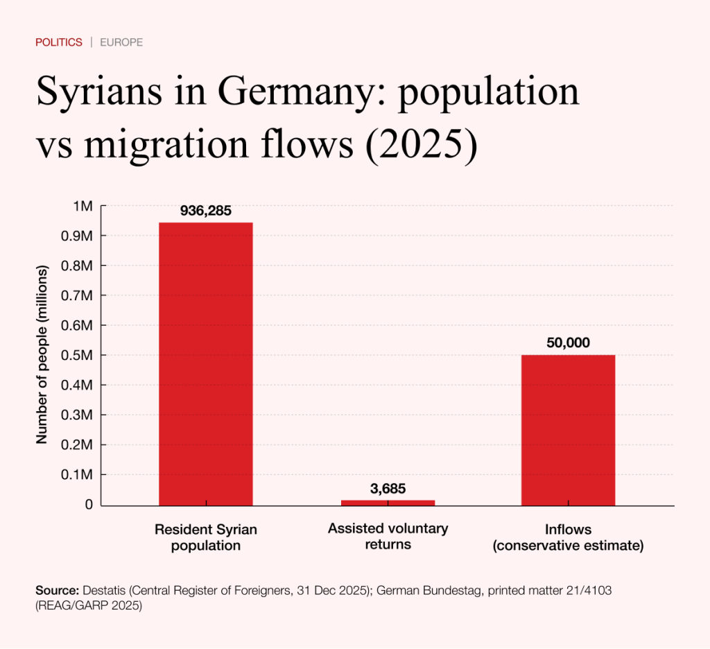 The scale of the task is evident from the figures. As of 31 December 2025, exactly 936,285 Syrian nationals were registered in Germany’s Central Register of Foreign Nationals. At the same time, return remains marginal. A total of 3,685 people left Germany in 2025 under state-supported programmes. Even including other departures, the overall scale remains small.