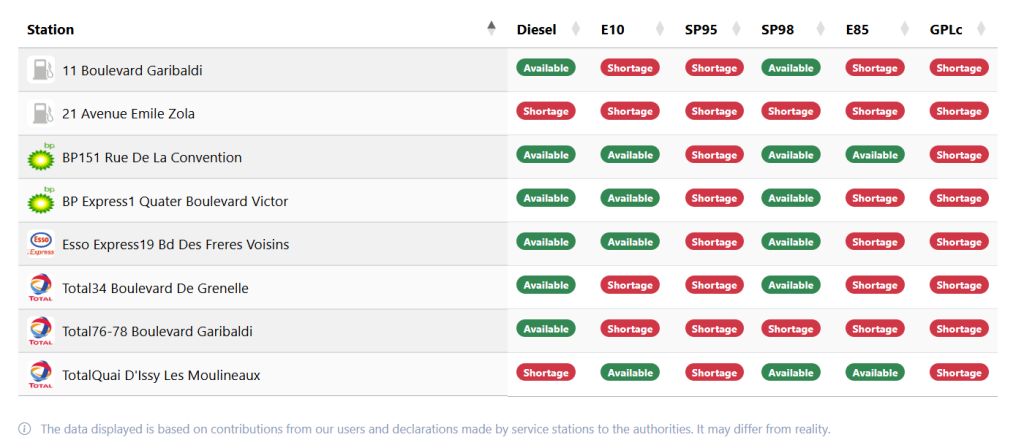 Many petrol stations in France, including several in Paris, are running low on fuel or have already run out of petrol and diesel. Source: Screenshot from the website penurie-carburant.fr