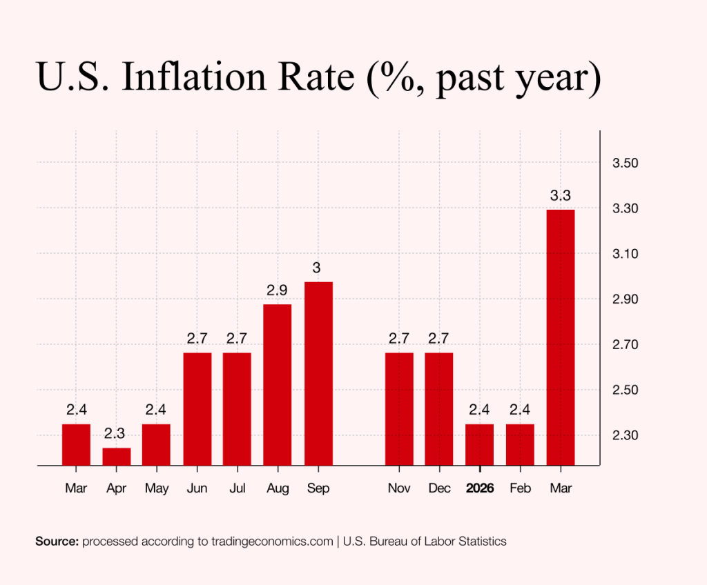 Inflation is rising, but not yet uncontrollably. Nevertheless, US inflation in March 2026 again delivered an unpleasant surprise. It accelerated to 3.3% year on year, the highest level since May 2024, after 2.4% in the previous two months.